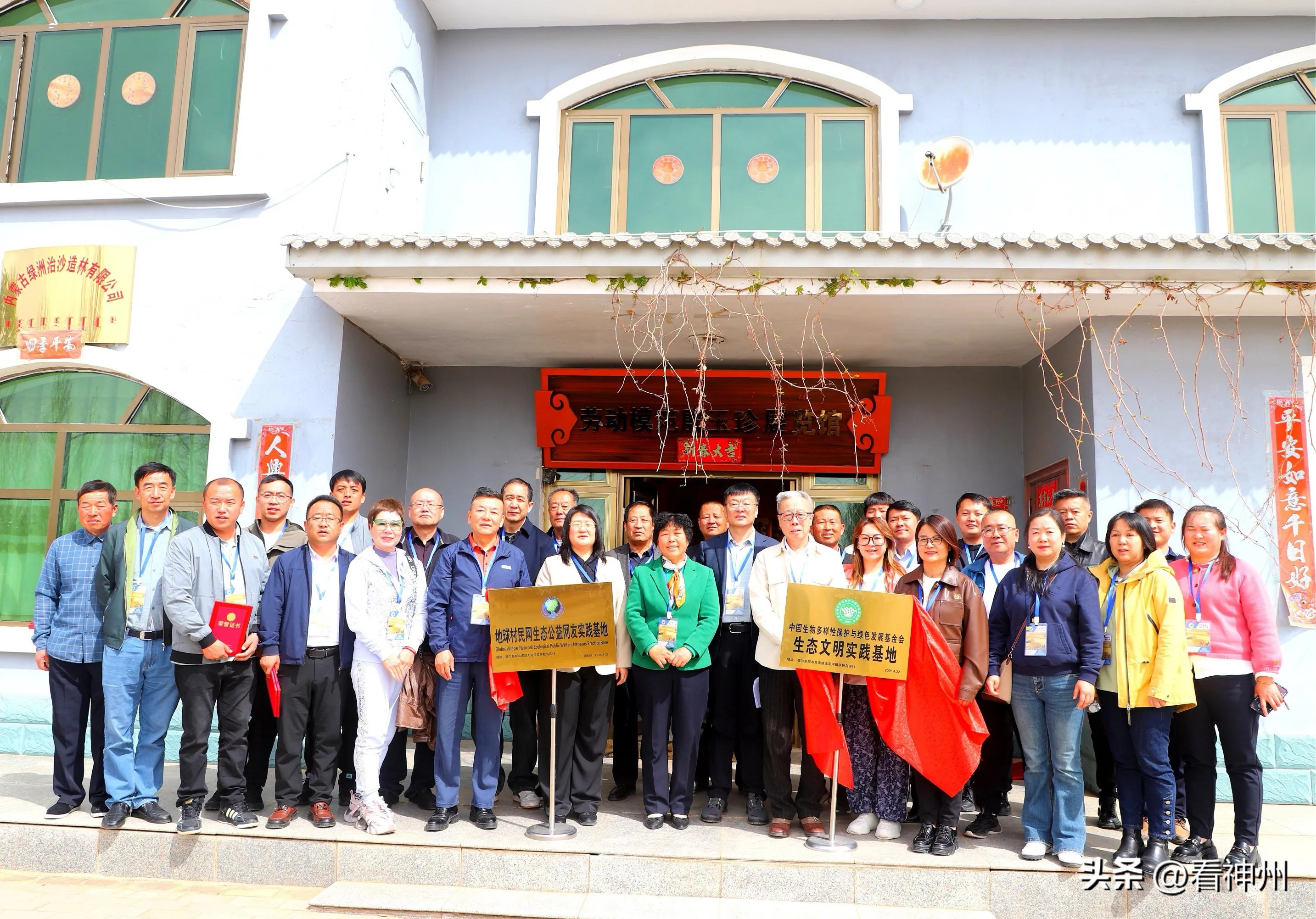 为了表达生态公益志愿和网友们对治沙英雄殷玉珍的敬意,中国绿发会生态文明指导委员会主任韩国伟向殷劳模颁发了“中国生物多样性保护与绿色发展基金会绿色生态文明标兵”荣誉牌匾,同时“中国生物多样性保护与绿色发展基金会生态文明实践基地”及“地球村民网生态公益网友实践基地”落户殷玉珍生态园区,成为全球生态公益志愿者们永久守望的绿色家园、实践研学基地。